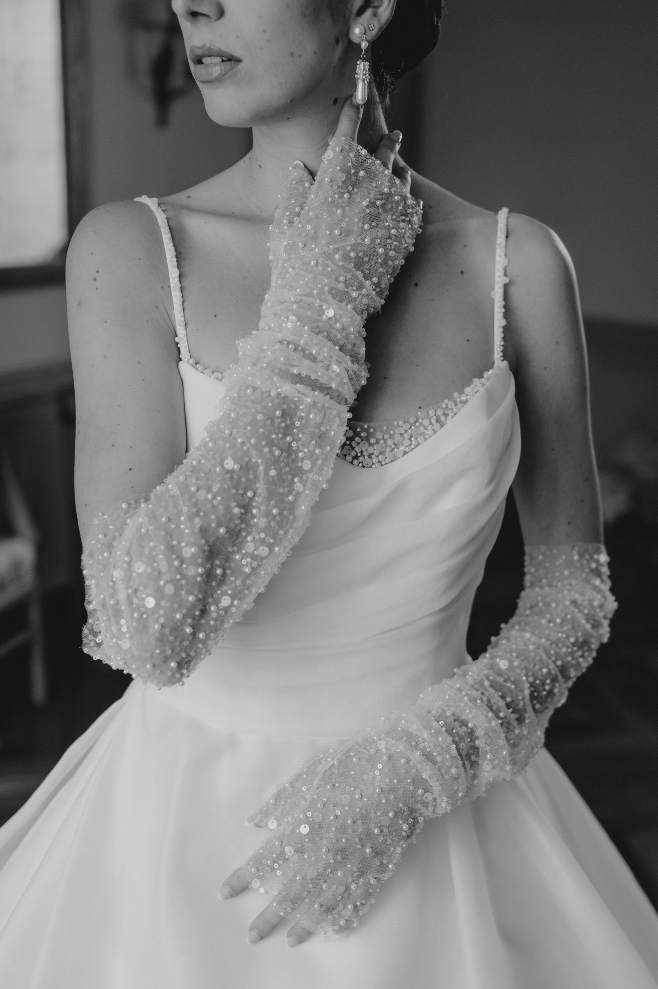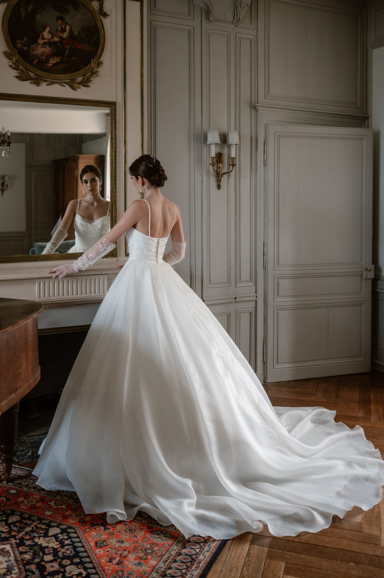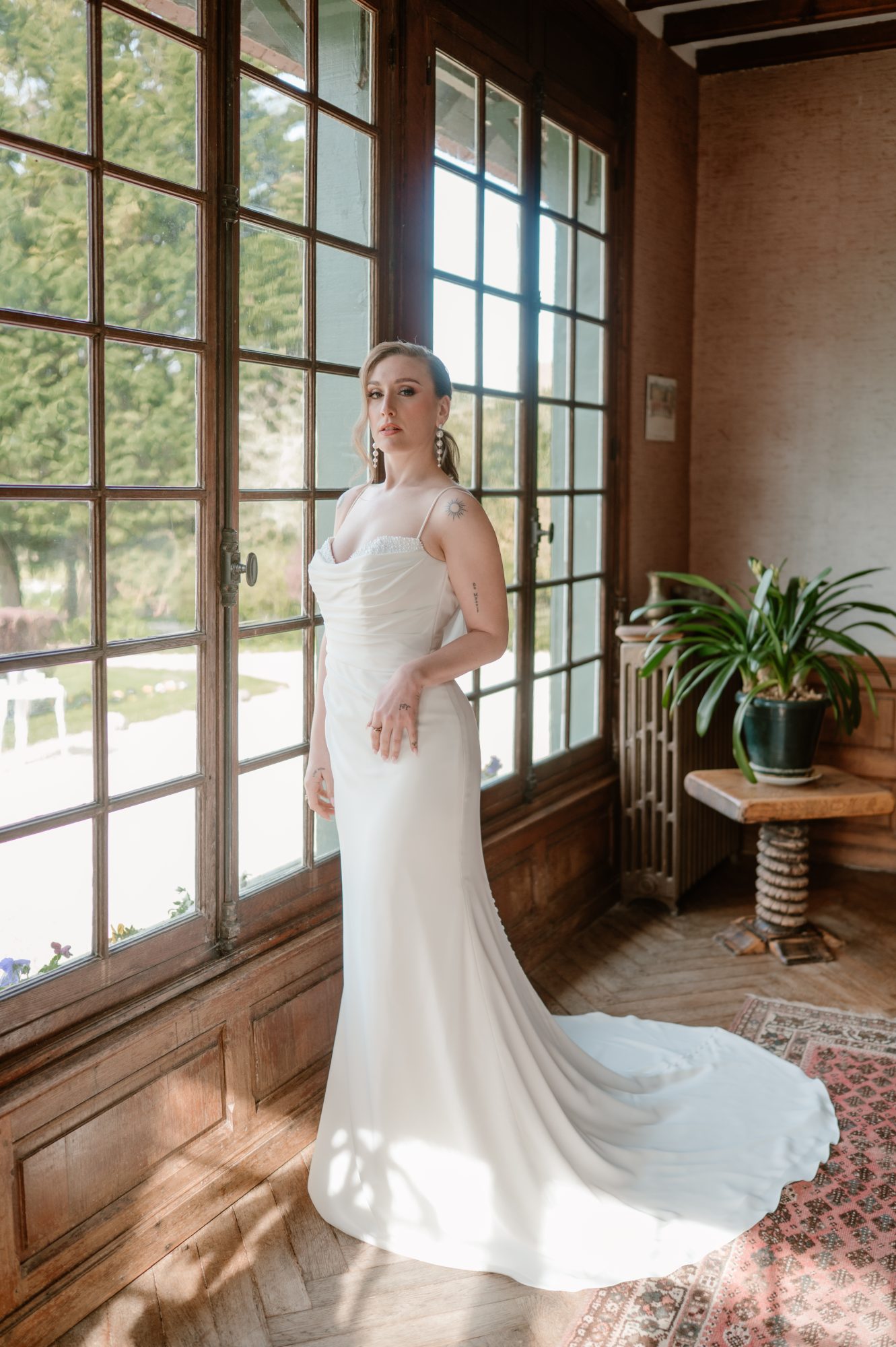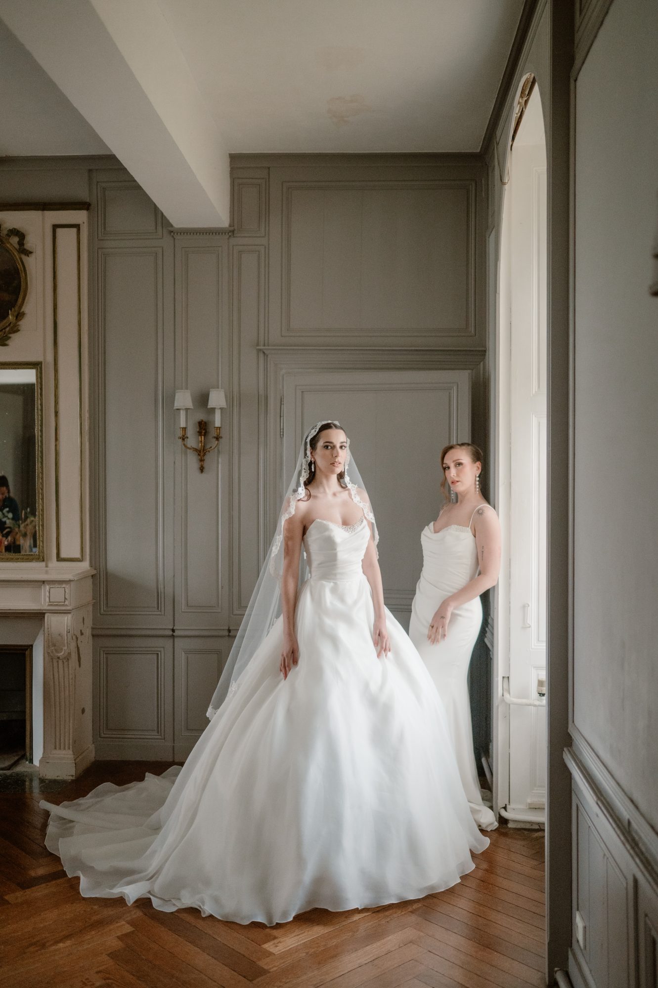 Bien sûr, les robes de mariée, les bijoux et les voiles présentés lors de ce shooting proviennent de la Maison Claire Duguey. Chaque création a été pensée pour sublimer la mariée dans un esprit chic et intemporel, en parfaite harmonie avec l’ambiance du lieu.